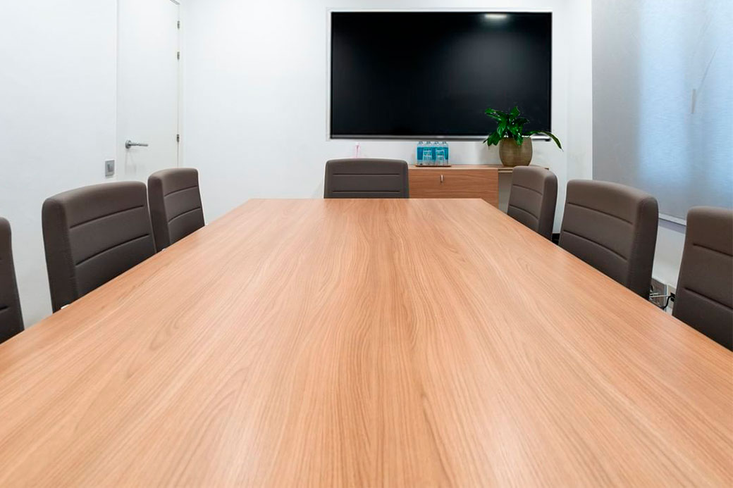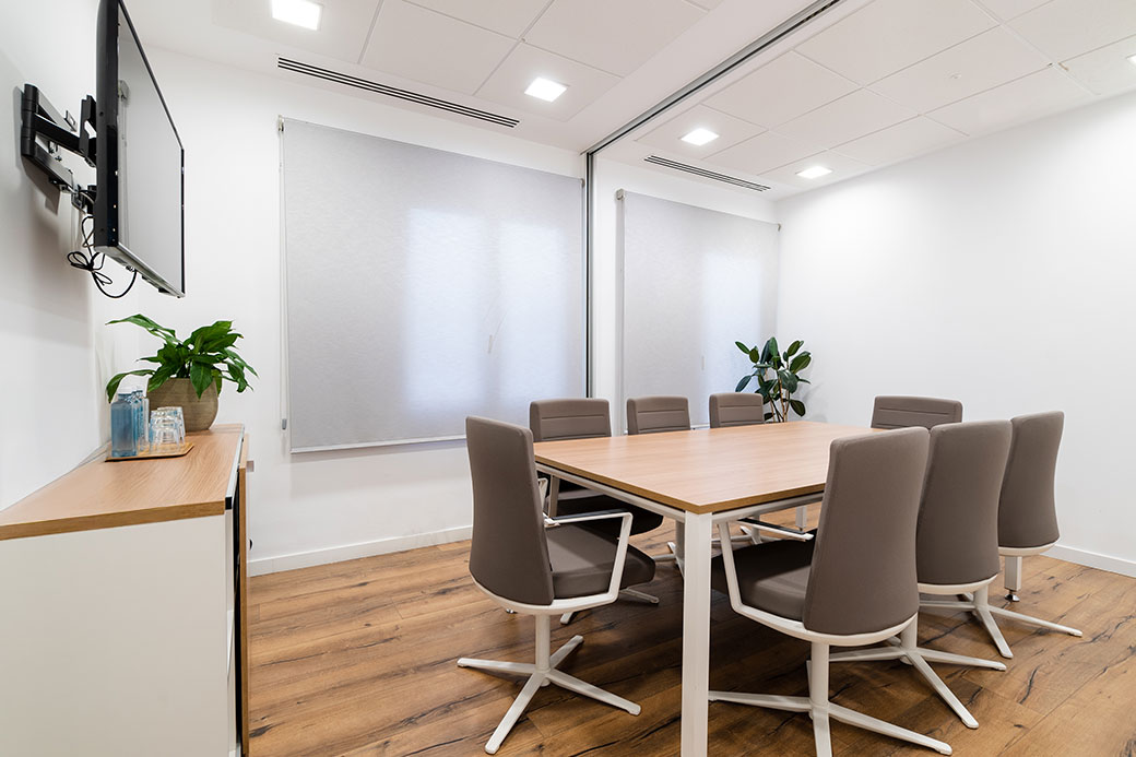Sala de reuniones interior, privada, con equipo audiovisual y capacidad para hasta 8 personas. Ideal para entrevistas de trabajo, reuniones de directivos o pequeñas formaciones.